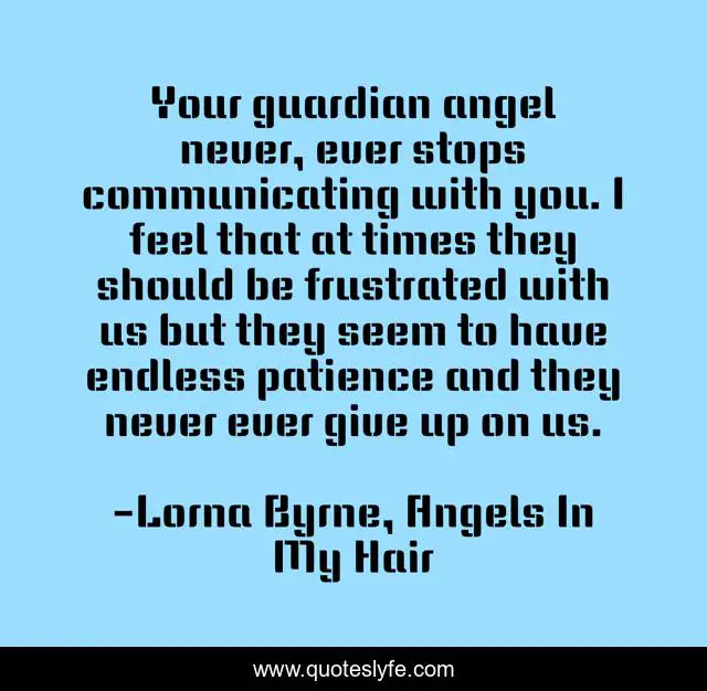 This page presents the quote "Your guardian angel never, ever stops communicating with you. I feel that at times they should be frustrated with us but they seem to have endless patience and they never ever give up on us.". Author of this quote is Lorna Byrne, Angels In My Hair. This quote is about angel, love, hope, affection, inspiration,.