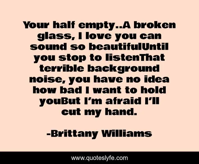 This page presents the quote "Your half empty..A broken glass, I love you can sound so beautifulUntil you stop to listenThat terrible background noise, you have no idea how bad I want to hold youBut I’m afraid I’ll cut my hand.". Author of this quote is Brittany Williams. This quote is about sadness, used, love-hurts,.
