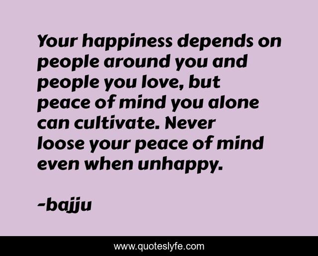 This page presents the quote "Your happiness depends on people around you and people you love, but peace of mind you alone can cultivate. Never loose your peace of mind even when unhappy.". Author of this quote is bajju. .