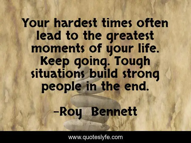 This page presents the quote "Your hardest times often lead to the greatest moments of your life. Keep going. Tough situations build strong people in the end.". Author of this quote is Roy Bennett. This quote is about faith, life, inspiration, being-positive, adversity, inspirational, enthusiasm, life-and-living, persistence,.