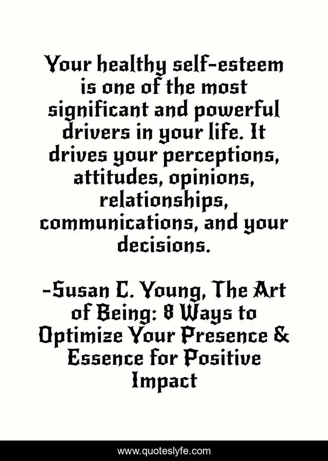 "Susan C. Young, The Art of Being: 8 Ways to Optimize Your Presence & Essence for Positive Impact Quotes." Quoteslyfe.com, 2025. Mon. 08 Dec. 2025. <https://www.quoteslyfe.com/quote/Your-healthy-self-esteem-is-one-of-142622>.