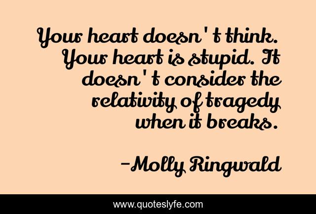This page presents the quote "Your heart doesn't think. Your heart is stupid. It doesn't consider the relativity of tragedy when it breaks.". Author of this quote is Molly Ringwald. This quote is about divorce, heartbreak, love, tragedy, affection,.