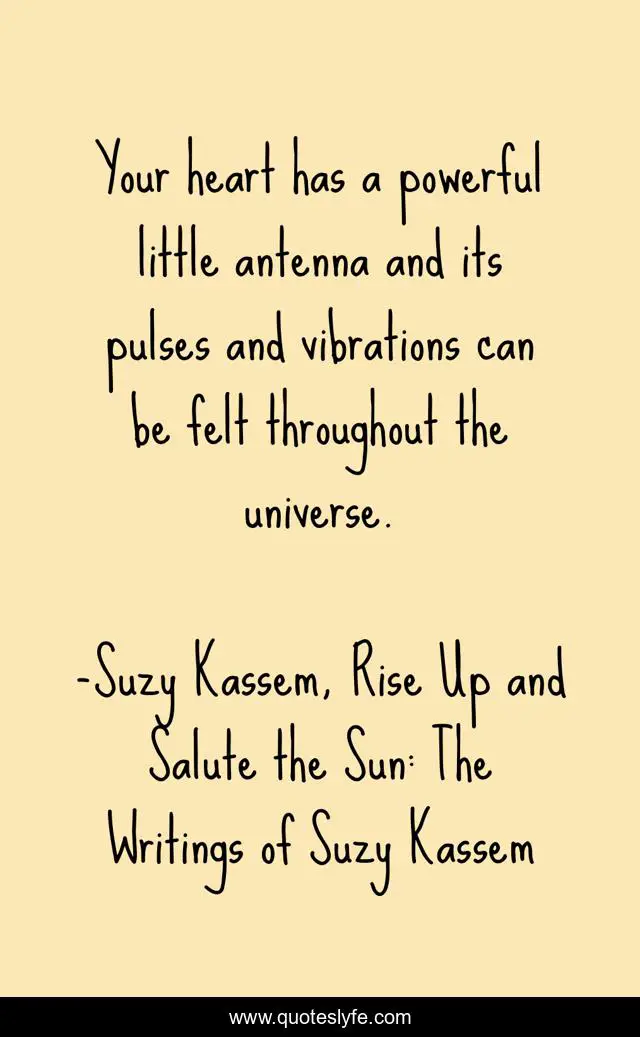 This page presents the quote "Your heart has a powerful little antenna and its pulses and vibrations can be felt throughout the universe.". Author of this quote is Suzy Kassem, Rise Up and Salute the Sun: The Writings of Suzy Kassem. This quote is about heart, spiritual, being, magnetic, magnetic-man, alive, feelings, heard, awakening,.