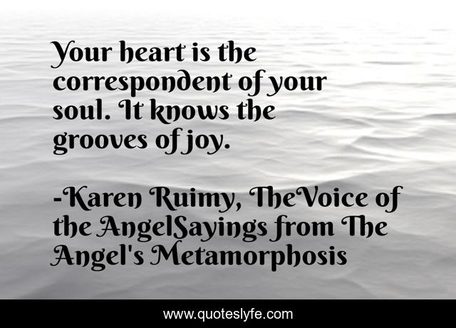 This page presents the quote "Your heart is the correspondent of your soul. It knows the grooves of joy.". Author of this quote is Karen Ruimy, TheVoice of the AngelSayings from The Angel's Metamorphosis. This quote is about spiritual, mind-body-connection, spirituality, mind-body-spirit, inspirational, enthusiasm,.