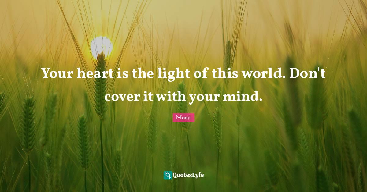 This page presents the quote "Your heart is the light of this world. Don't cover it with your mind.". Author of this quote is Mooji. This quote is about light, heart, this world, mind,.