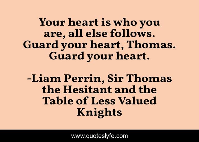 This page presents the quote "Your heart is who you are, all else follows. Guard your heart, Thomas. Guard your heart.". Author of this quote is Liam Perrin, Sir Thomas the Hesitant and the Table of Less Valued Knights. This quote is about heart, advice, self-awareness, encouragement, wisdom,.
