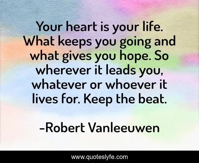 This page presents the quote "Your heart is your life. What keeps you going and what gives you hope. So wherever it leads you, whatever or whoever it lives for. Keep the beat.". Author of this quote is Robert Vanleeuwen. This quote is about heart, life, love, compassion, hope, sincerity, affection,.