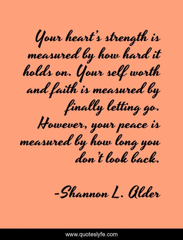 This page presents the quote "Your heart’s strength is measured by how hard it holds on. Your self worth and faith is measured by finally letting go. However, your peace is measured by how long you don’t look back.". Author of this quote is Shannon L. Alder. This quote is about relationships, dignity, ends, love, family, beginnings, faith, letting-go, life,.