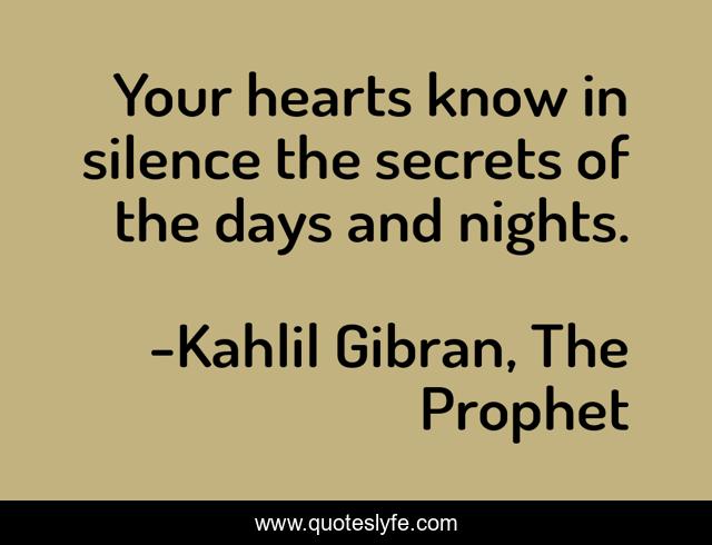 This page presents the quote "Your hearts know in silence the secrets of the days and nights.". Author of this quote is Kahlil Gibran, The Prophet. This quote is about heart, life, secrets, quiet, wisdom, secret, hearts, silence,.