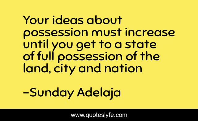 This page presents the quote "Your ideas about possession must increase until you get to a state of full possession of the land, city and nation". Author of this quote is Sunday Adelaja. This quote is about possession, city, full, get, ideas, increase, state, land, and-nation,.