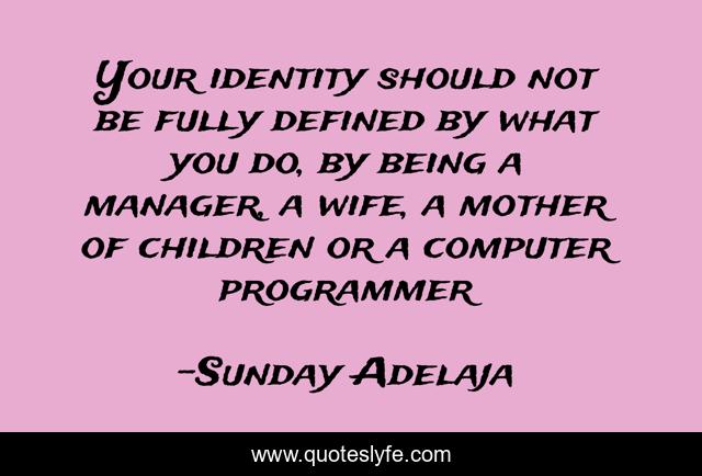 This page presents the quote "Your identity should not be fully defined by what you do, by being a manager, a wife, a mother of children or a computer programmer". Author of this quote is Sunday Adelaja. This quote is about definition, life, true-identity, family, wife, calling, manager, self-identity, purpose,.