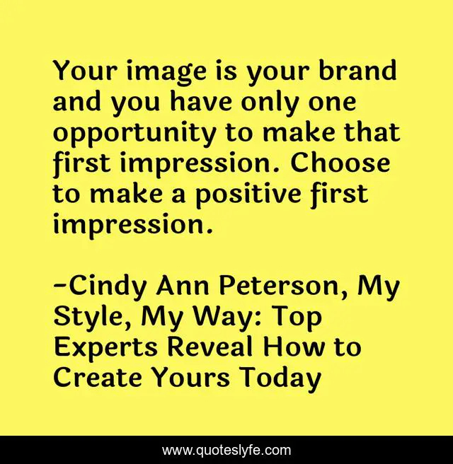 This page presents the quote "Your image is your brand and you have only one opportunity to make that first impression. Choose to make a positive first impression.". Author of this quote is Cindy Ann Peterson, My Style, My Way: Top Experts Reveal How to Create Yours Today. This quote is about confidence, branding, positivity, motivational, style, wisdom, charisma, goals, positive,.