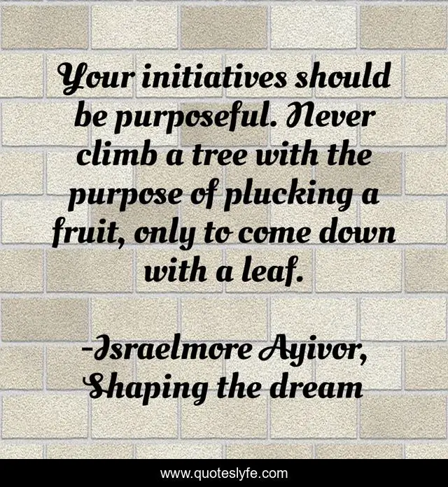 This page presents the quote "Your initiatives should be purposeful. Never climb a tree with the purpose of plucking a fruit, only to come down with a leaf.". Author of this quote is Israelmore Ayivor, Shaping the dream. This quote is about initiatives, leaf, success, successful, purposeful, food-for-thought, initiate, purpose, fruits,.