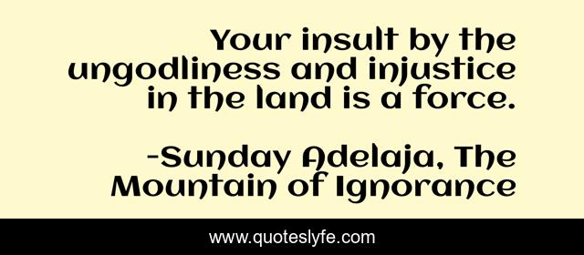 This page presents the quote "Your insult by the ungodliness and injustice in the land is a force.". Author of this quote is Sunday Adelaja, The Mountain of Ignorance. This quote is about mountain, life, land, force, darkness, power, danger, god, people,.