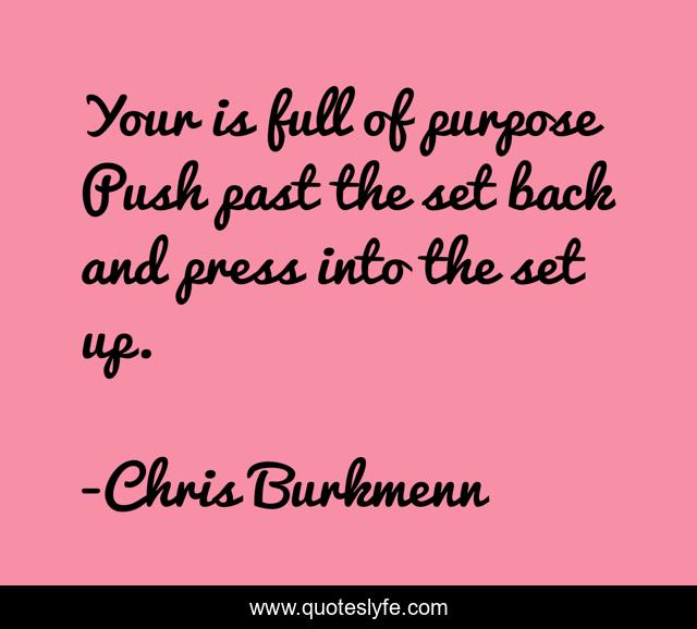 This page presents the quote "Your is full of purpose Push past the set back and press into the set up.". Author of this quote is Chris Burkmenn. This quote is about love, god, jesus, single, purpose, believe, dreams, affection, victory,.