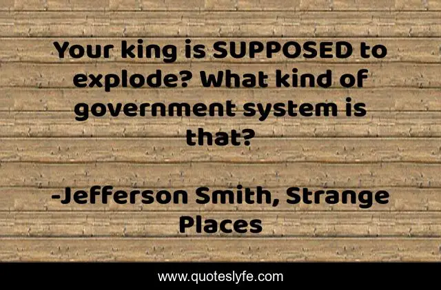This page presents the quote "Your king is SUPPOSED to explode? What kind of government system is that?". Author of this quote is Jefferson Smith, Strange Places. This quote is about humor, humour, government, monarchy, fantasy, royalty, kings, young-adult,.