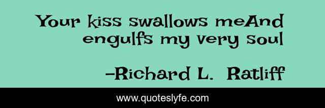 This page presents the quote "Your kiss swallows meAnd engulfs my very soul". Author of this quote is Richard L. Ratliff. This quote is about emotion, love, soul, passion, engulf, kiss, kissing, swallow, passionate,.