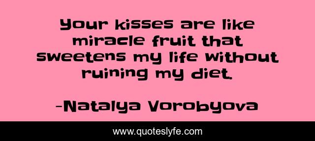 This page presents the quote "Your kisses are like miracle fruit that sweetens my life without ruining my diet.". Author of this quote is Natalya Vorobyova. This quote is about life, sweet, diet, romance, fruit, miracle, kiss,.