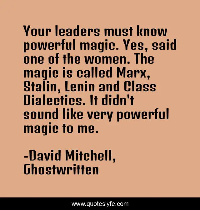 This page presents the quote "Your leaders must know powerful magic. Yes, said one of the women. The magic is called Marx, Stalin, Lenin and Class Dialectics. It didn't sound like very powerful magic to me.". Author of this quote is David Mitchell, Ghostwritten. This quote is about marxism, communism,.