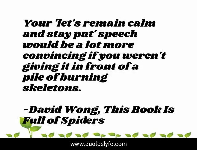 This page presents the quote "Your 'let's remain calm and stay put' speech would be a lot more convincing if you weren't giving it in front of a pile of burning skeletons.". Author of this quote is David Wong, This Book Is Full of Spiders. This quote is about burning-skeletons, convincing, pile-of-skeletons, david-wong, speech, remain-calm, skeletons,.