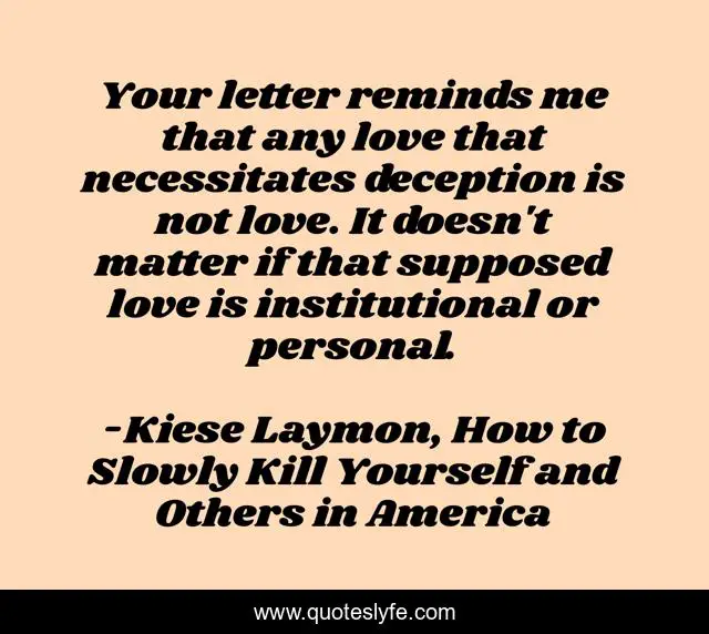 This page presents the quote "Your letter reminds me that any love that necessitates deception is not love. It doesn't matter if that supposed love is institutional or personal.". Author of this quote is Kiese Laymon, How to Slowly Kill Yourself and Others in America. This quote is about deception, love, affection,.