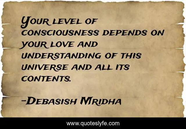 This page presents the quote "Your level of consciousness depends on your love and understanding of this universe and all its contents.". Author of this quote is Debasish Mridha. This quote is about love, consciousness, universe, philosophy, debasish-mridha, quotes, inspirational, understanding-of-this-universe, enthusiasm,.