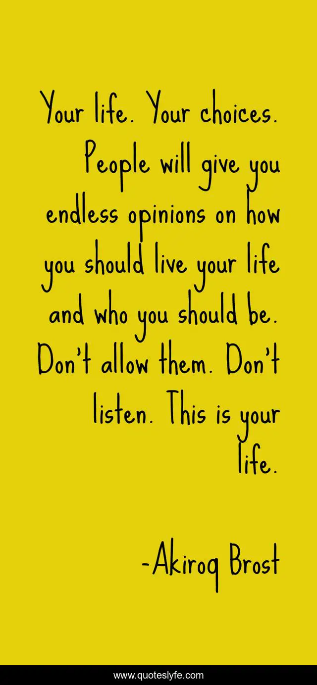 This page presents the quote "Your life. Your choices. People will give you endless opinions on how you should live your life and who you should be. Don't allow them. Don't listen. This is your life.". Author of this quote is Akiroq Brost. This quote is about opinions, choices,.