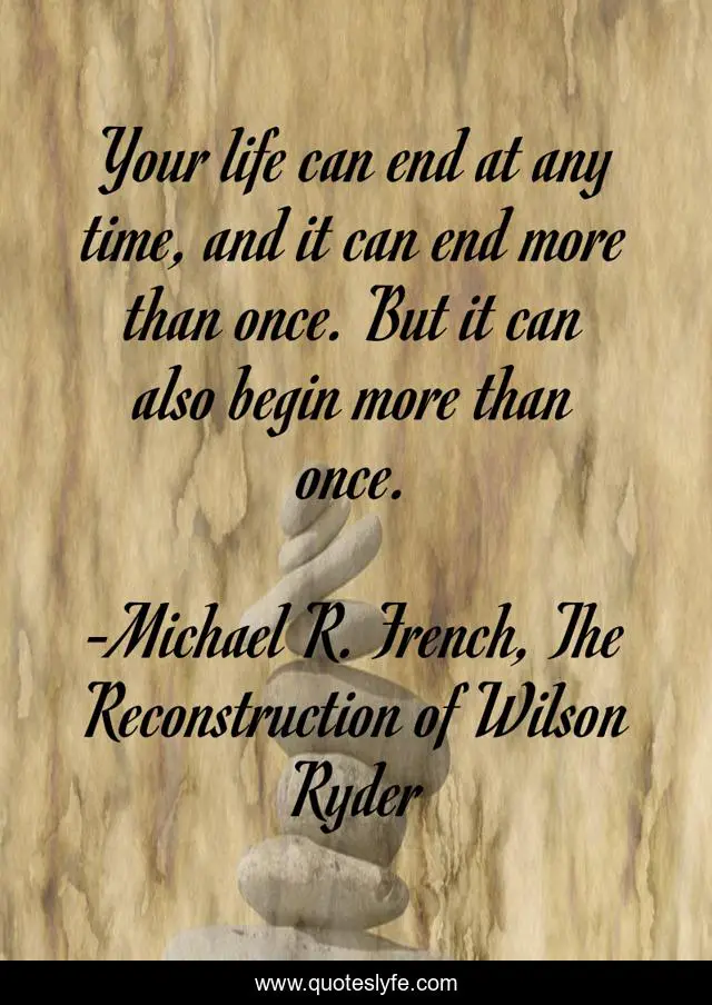 This page presents the quote "Your life can end at any time, and it can end more than once. But it can also begin more than once.". Author of this quote is Michael R. French, The Reconstruction of Wilson Ryder. This quote is about life, death, reinventing-yourself, begin-again, begin-again-wisdom, life-and-living, death-and-dying,.