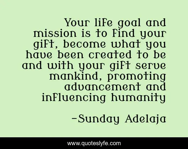 This page presents the quote "Your life goal and mission is to find your gift, become what you have been created to be and with your gift serve mankind, promoting advancement and influencing humanity". Author of this quote is Sunday Adelaja. This quote is about life, goal, gift, creator, creation, influence, advancement, mission, service,.