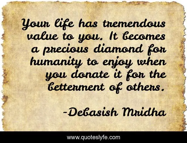 This page presents the quote "Your life has tremendous value to you. It becomes a precious diamond for humanity to enjoy when you donate it for the betterment of others.". Author of this quote is Debasish Mridha. This quote is about life-wisdom, philosophy, debasish-mridha, debasish-mridha-m-d, quotes, inspirational, your-life-has-value, enthusiasm, humanity,.