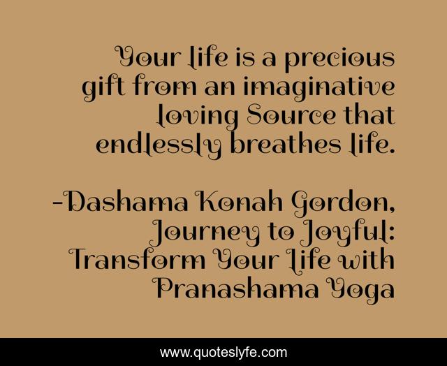 This page presents the quote "Your life is a precious gift from an imaginative loving Source that endlessly breathes life.". Author of this quote is Dashama Konah Gordon, Journey to Joyful: Transform Your Life with Pranashama Yoga. This quote is about gratitude, love, success, dashama, health, self-improvement, inspirational, enthusiasm, yoga,.