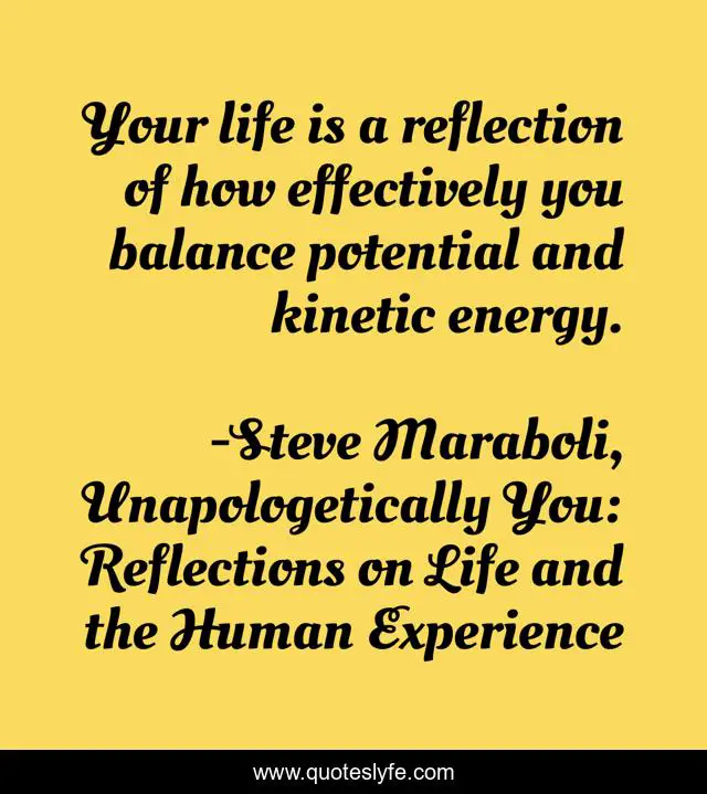 This page presents the quote "Your life is a reflection of how effectively you balance potential and kinetic energy.". Author of this quote is Steve Maraboli, Unapologetically You: Reflections on Life and the Human Experience. This quote is about life, reflection, success, potential, goals, action, balance, kinetic-energy, dreams,.
