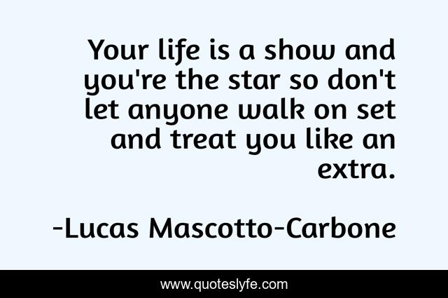 This page presents the quote "Your life is a show and you're the star so don't let anyone walk on set and treat you like an extra.". Author of this quote is Lucas Mascotto-Carbone. This quote is about confidence, strength, positive, motivational, optimistic, inspirational, attitude-toward-life, inspirational-life, enthusiasm,.
