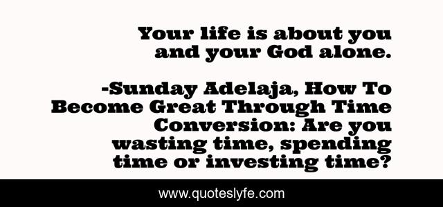 This page presents the quote "Your life is about you and your God alone.". Author of this quote is Sunday Adelaja, How To Become Great Through Time Conversion: Are you wasting time, spending time or investing time?. This quote is about convert, work, productivity, wealth, gift, greatness, life, great, value,.