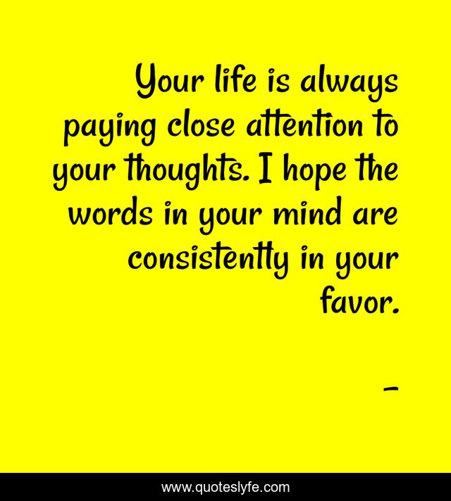 This page presents the quote "Your life is always paying close attention to your thoughts. I hope the words in your mind are consistently in your favor.". Author of this quote is . This quote is about edmond-mbiaka, payig-attention-to-your-thoughts, the-words-you-feed-to-your-mind,.