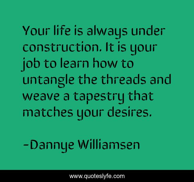 This page presents the quote "Your life is always under construction. It is your job to learn how to untangle the threads and weave a tapestry that matches your desires.". Author of this quote is Dannye Williamsen. .