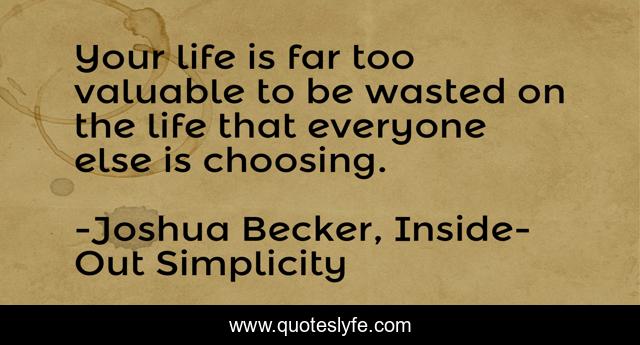 This page presents the quote "Your life is far too valuable to be wasted on the life that everyone else is choosing.". Author of this quote is Joshua Becker, Inside-Out Simplicity. This quote is about simplicity-in-life, life-and-living, inspire,.