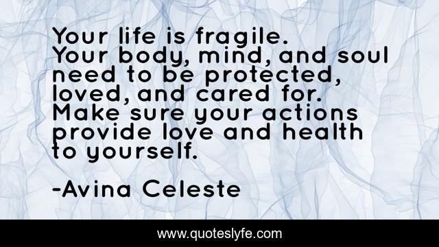This page presents the quote "Your life is fragile. Your body, mind, and soul need to be protected, loved, and cared for. Make sure your actions provide love and health to yourself.". Author of this quote is Avina Celeste. This quote is about life, fragile, soul, protection, inspirational, enthusiasm,.