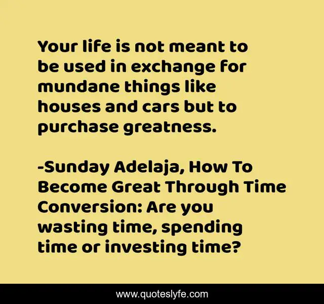 This page presents the quote "Your life is not meant to be used in exchange for mundane things like houses and cars but to purchase greatness.". Author of this quote is Sunday Adelaja, How To Become Great Through Time Conversion: Are you wasting time, spending time or investing time?. This quote is about life, conversion, productivity, wealth, greatness, waste, humanity, product, cars,.