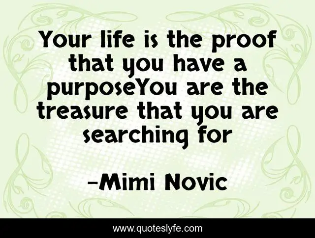 This page presents the quote "Your life is the proof that you have a purposeYou are the treasure that you are searching for". Author of this quote is Mimi Novic. This quote is about treasure-of-thoughts, hope-for-each-day, inspirational-attitude, spiritual-development, life-and-living, transformation,.