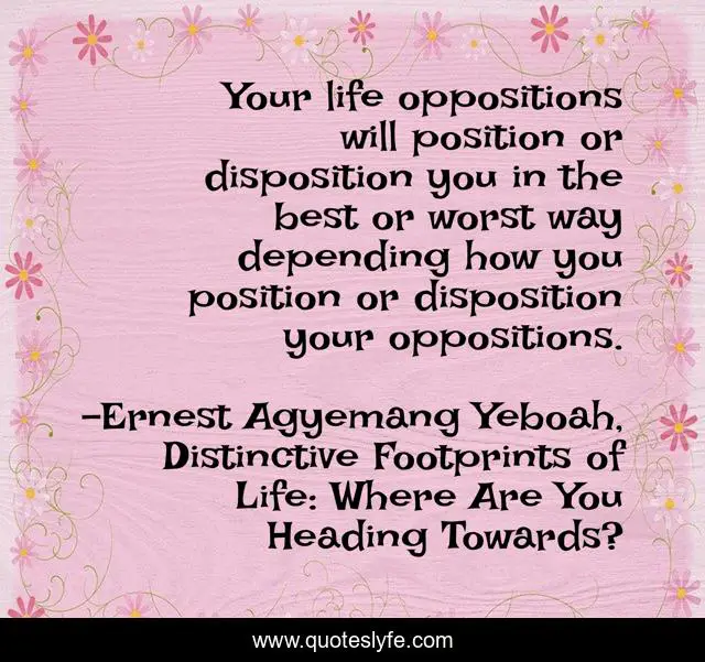"Ernest Agyemang Yeboah, Distinctive Footprints of Life: Where Are You Heading Towards? Quotes." Quoteslyfe.com, 2025. Fri. 05 Dec. 2025. <https://www.quoteslyfe.com/quote/Your-life-oppositions-will-position-or-disposition-216080>.