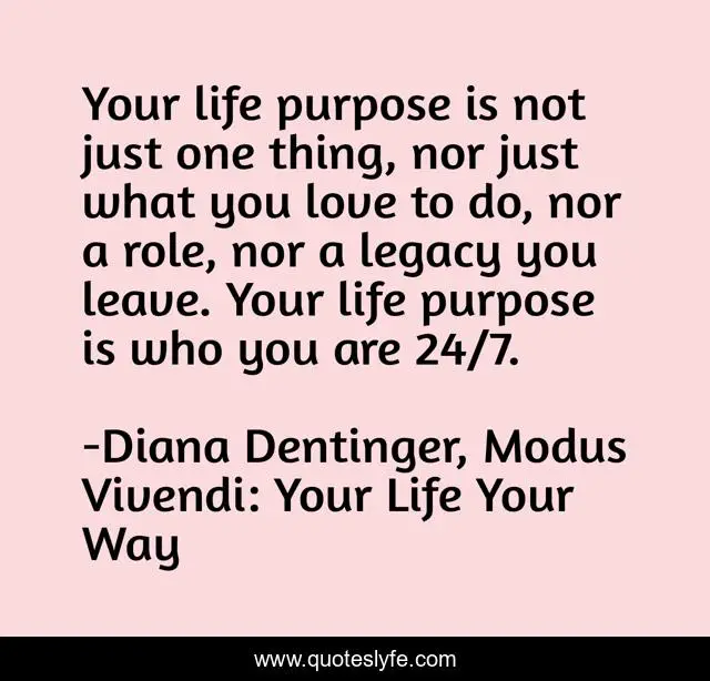 This page presents the quote "Your life purpose is not just one thing, nor just what you love to do, nor a role, nor a legacy you leave. Your life purpose is who you are 24/7.". Author of this quote is Diana Dentinger, Modus Vivendi: Your Life Your Way. This quote is about spiritual-growth, confidence, meaning-of-life, personal-growth, positive, motivational, life-purpose, optimistic, inspirational,.
