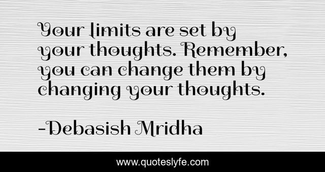 This page presents the quote "Your limits are set by your thoughts. Remember, you can change them by changing your thoughts.". Author of this quote is Debasish Mridha. This quote is about change-your-thoughts, limits, philosophy, debasish-mridha, quotes, inspirational, enthusiasm, debasish-mridha-m-d, thoughts,.