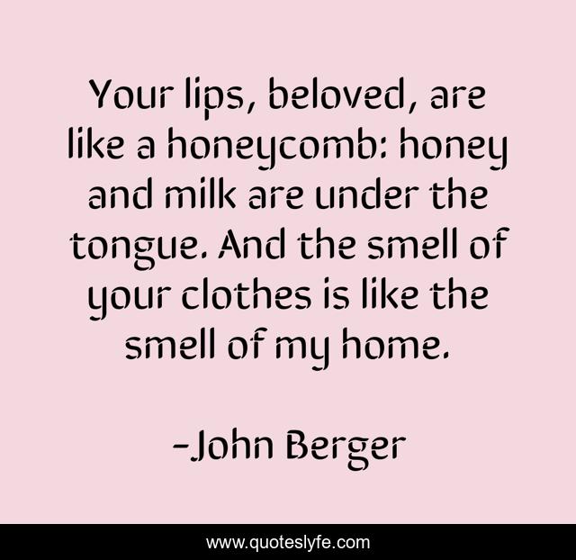 This page presents the quote "Your lips, beloved, are like a honeycomb: honey and milk are under the tongue. And the smell of your clothes is like the smell of my home.". Author of this quote is John Berger. .