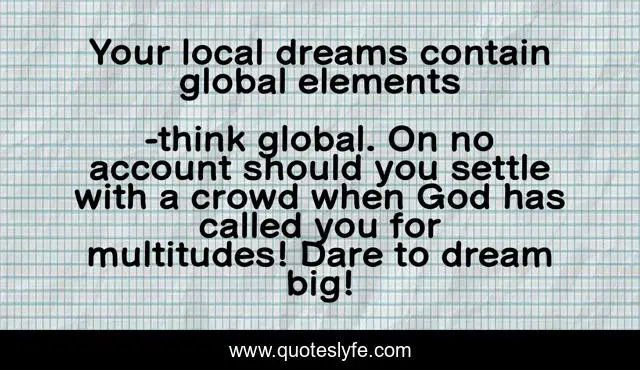 "think global. On no account should you settle with a crowd when God has called you for multitudes! Dare to dream big! Quotes." Quoteslyfe.com, 2025. Sat. 06 Dec. 2025. <https://www.quoteslyfe.com/quote/Your-local-dreams-contain-global-elements-140555>.