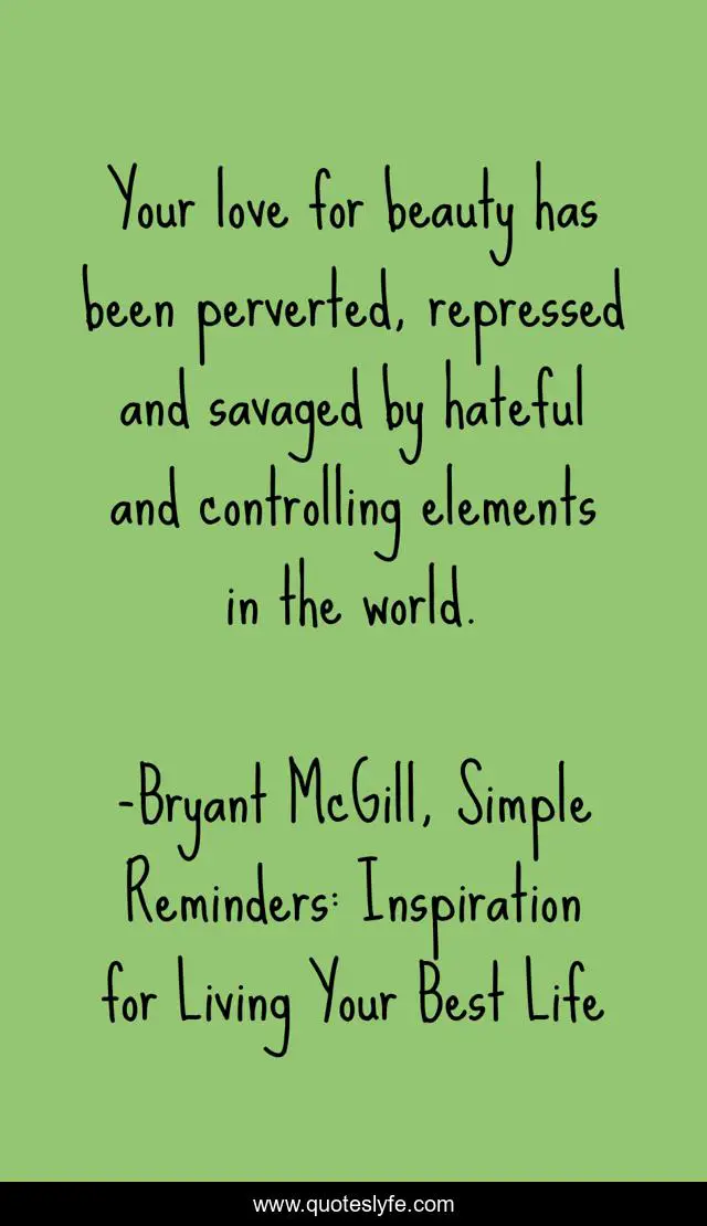 This page presents the quote "Your love for beauty has been perverted, repressed and savaged by hateful and controlling elements in the world.". Author of this quote is Bryant McGill, Simple Reminders: Inspiration for Living Your Best Life. This quote is about control, savagery, beauty, perversion, repression, love, hate, affection,.