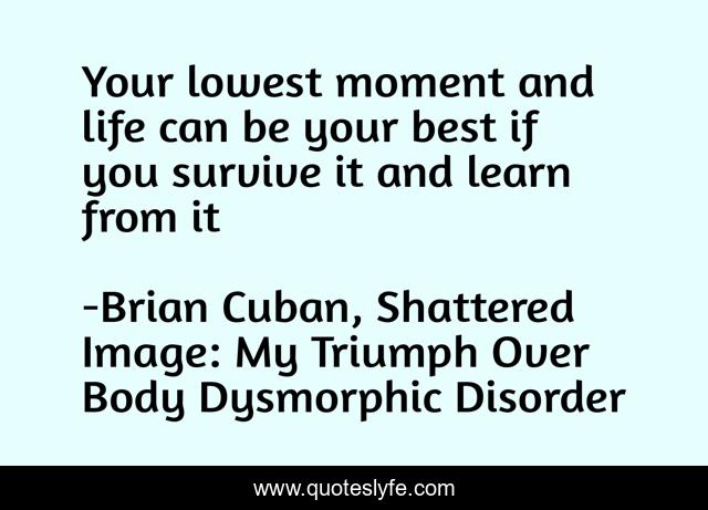 This page presents the quote "Your lowest moment and life can be your best if you survive it and learn from it". Author of this quote is Brian Cuban, Shattered Image: My Triumph Over Body Dysmorphic Disorder. This quote is about body-image, bulimia, body-dysmorphic-disorder, addiction, eating-disorders,.
