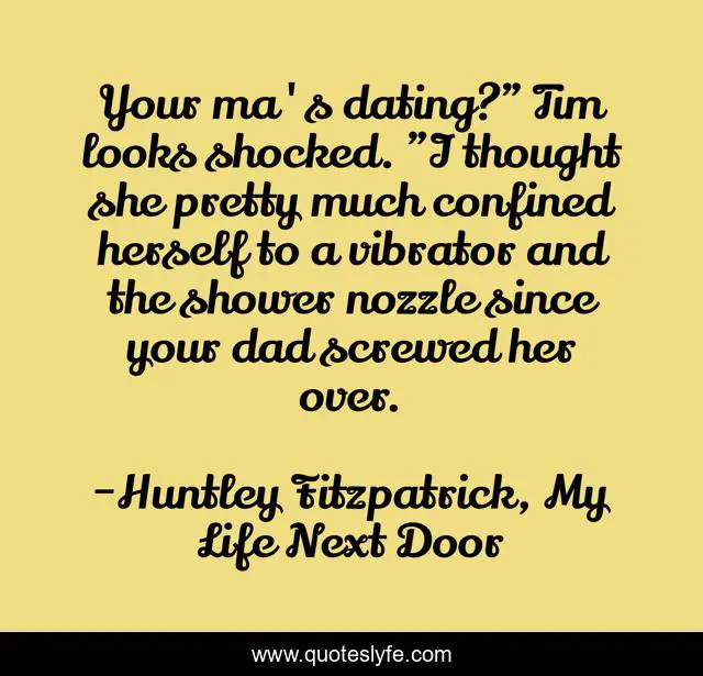 This page presents the quote "Your ma's dating?" Tim looks shocked. "I thought she pretty much confined herself to a vibrator and the shower nozzle since your dad screwed her over.". Author of this quote is Huntley Fitzpatrick, My Life Next Door. .