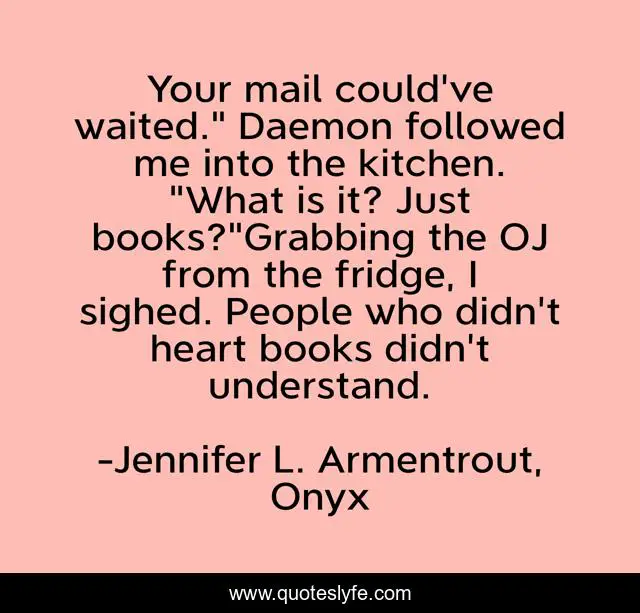This page presents the quote "Your mail could've waited." Daemon followed me into the kitchen. "What is it? Just books?"Grabbing the OJ from the fridge, I sighed. People who didn't heart books didn't understand.". Author of this quote is Jennifer L. Armentrout, Onyx. This quote is about funny, books, comedy,.