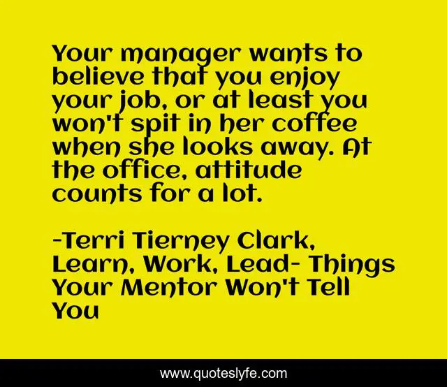 This page presents the quote "Your manager wants to believe that you enjoy your job, or at least you won't spit in her coffee when she looks away. At the office, attitude counts for a lot.". Author of this quote is Terri Tierney Clark, Learn, Work, Lead- Things Your Mentor Won't Tell You. This quote is about business, career, millennial, behaviour, attitude, gen-y,.
